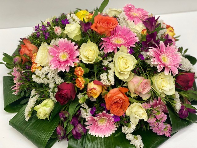 Het biedermeier wordt door ons met grote zorg samengesteld. Het rouwstuk bestaat uit witte, rode, gele, roze en oranje rozen, roze/paars alstroemeria, witte limonium, roze gerbera, oranje en paars anjers en wordt netjes afgewerkt met bijpassend bladgroen. Let wel, bloemen zijn seizoensgebonden natuurproducten. Hierdoor kan het biedermeier van tijd tot tijd qua uiterlijk iets afwijken van de getoonde afbeelding. Dit heeft echter geen invloed op de kwaliteit van het rouwstuk.