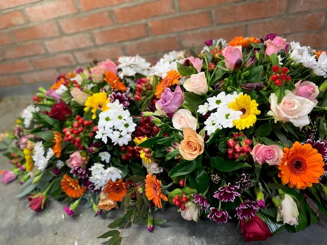 Ons kistbedekking rouwstuk wordt met grote zorg en aandacht samengesteld. Het arrangement bevat een prachtige mix van paars en witte chrysanten, roze, geel, witte en donker roze rozen, roze alstroemeria, paars lem, oranje en geel gerbera, rode anjers en rode hypericum. Dit alles wordt zorgvuldig afgewerkt met bijpassend groen.