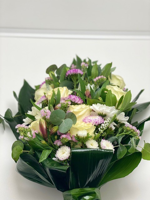 Het rouwboeket wordt door ons met grote zorg samengesteld. Het rouwstuk bestaat uit witte rozen, witte chrysanten, witte veronica, roze astroemeria, roze lim en roze aster en wordt netjes afgewerkt met bijpassend bladgroen. Let wel, bloemen zijn seizoensgebonden natuurproducten. Hierdoor kan het rouwboeket van tijd tot tijd qua uiterlijk iets afwijken van de getoonde afbeelding. Dit heeft echter geen invloed op de kwaliteit van het rouwboeket